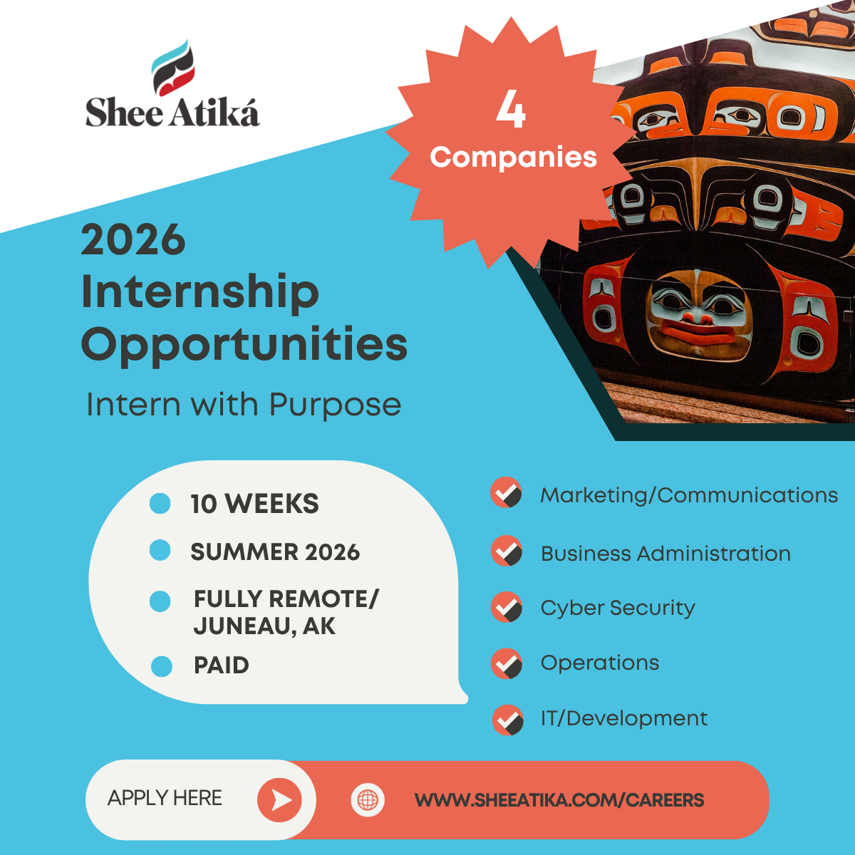 We’re excited to announce the launch of our 2026 Summer Intern Program at the Shee Atiká Family of Companies! This initiative offers a meaningful opportunity for college students to gain hands-on experience while working alongside seasoned professionals in a supportive and dynamic environment.